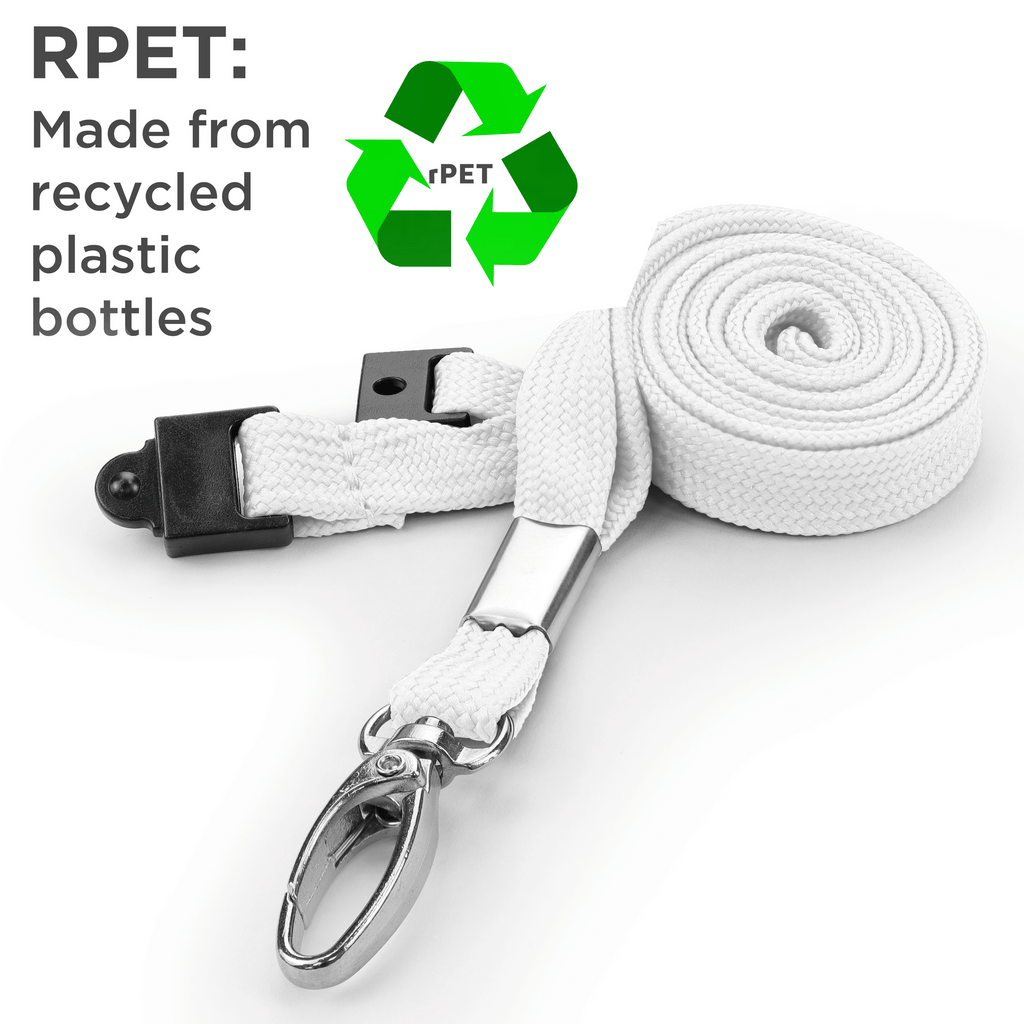 These high-quality, flat-braid, woven white recycled lanyards are both discreet and comfortable to wear. Made from recycled plastic bottles, with a variety of plain colours available, they provide an simple way for staff to display their ID cards, making them easily identifiable from a distance.